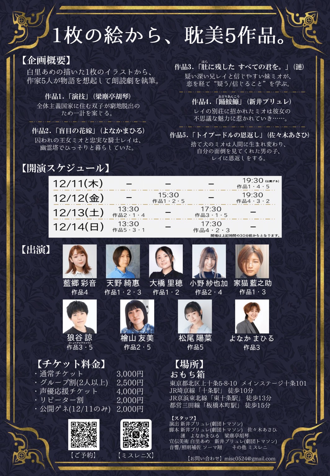 脚本:新井プリュレ(劇団トマソン) / 佐々木あさひ / 漣 / 梁塵亭胡琴 / よなかまひる